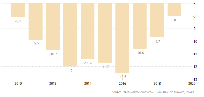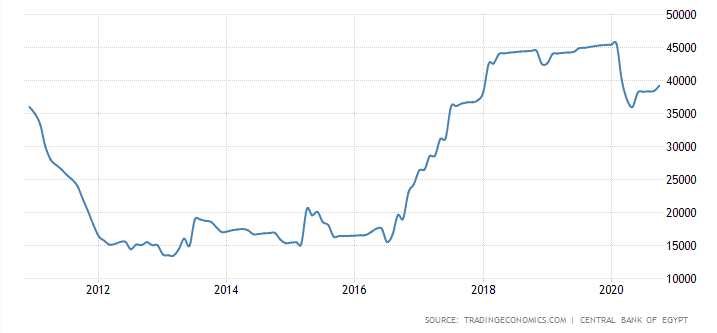 Following years of crises and mismanagement, Egypt ran out of dollars. The Egyptian Pound (EGP) devaluated from EGP8 to EGP18 per USD in a matter of months. Inflation soared to above 30% in 2017, plunging millions into poverty. A low point was reached and thenceforth the situation improved.