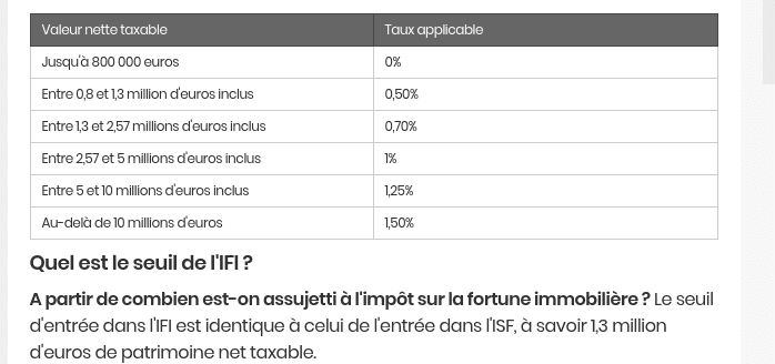 - There’s a wealth tax for those who have over 1.3 million Euros of real estate in France. If you pass that threshold, you will have to pay a wealth tax of the equivalent of 0.5% of the net value retroactively from 800,000 euros to 1.3 million euros, and from there 0.7% and even more.