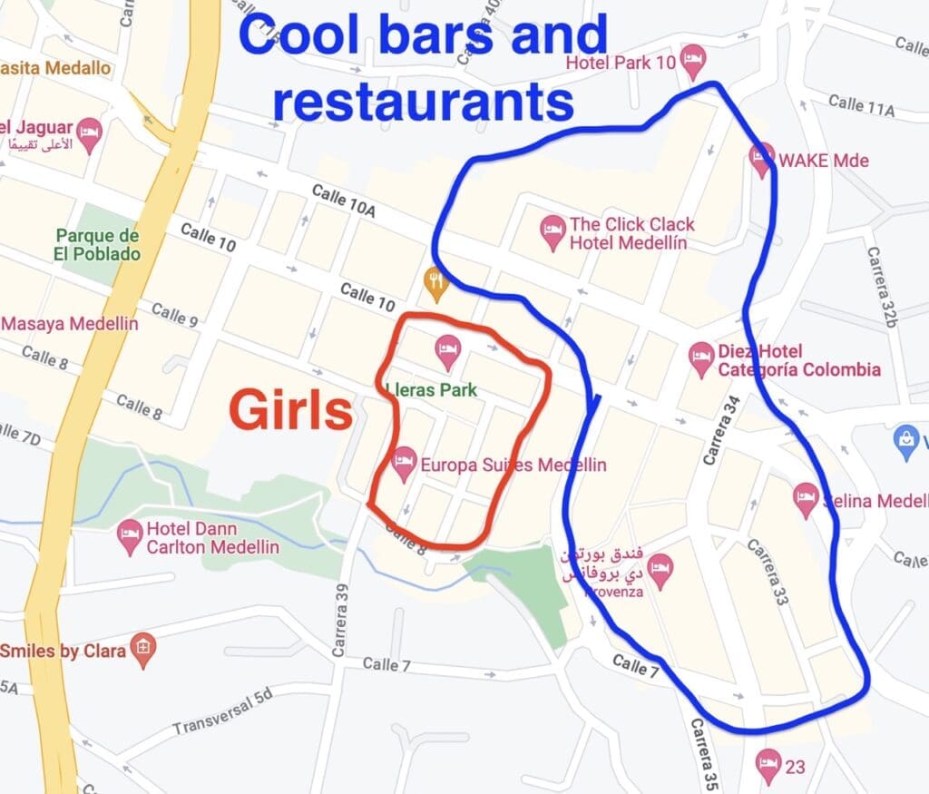 Technically these neighbourhoods are part of El Poblado, but they are so notorious that they deserve a special mention. Essentially, they are where most tourists spend time, and where wealthy locals like to go eating and partying. This map below is crucial for you to understand.