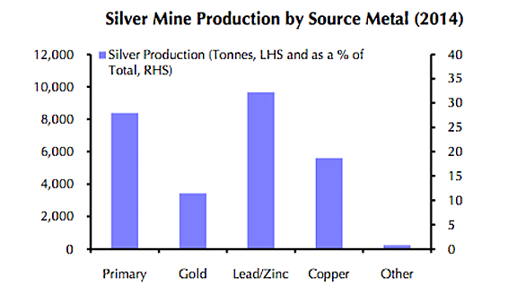 - Most silver is produced as a byproduct of mining other commodities. These numbers below are not the most recent, but they are adequate enough for the purpose of this article. Essentially, with lead and zinc prices being very low, this will negatively impact their production volumes – this means less silver as a byproduct.