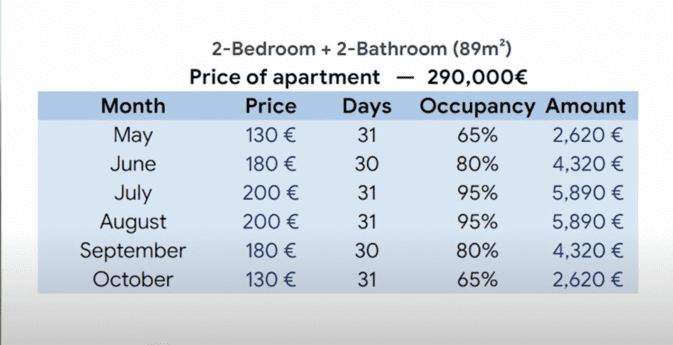 KSENIJA: May, we have the occupancy rate 65% and the price per night they stay €130. Already in June, as the season is picking up, we have the occupancy rates around 80% and the price per night is €180. And then, again, July and August, it’s €200, and the occupancy rates go up to 95%. September and October, slightly lower, €180, 80% in September, and then October, €130 and 65% occupancy.